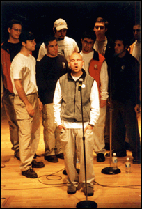 In addition to performing on campus and in the community, the Chips also have been active in vocal competition, taking first place last February in the first round of the National Championship of Collegiate A Cappella held at Bryn Mawr College; they have applied to participate in the 2001 competition. Like the Pitches, they specialize in the contemporary repertoire, which can range from Aerosmith and Billy Joel to songs from the most recent radio playlists. According to baritone John Taylor, a biology/premed freshman from Rome, the Chips' roster of academic majors includes "a couple of premeds, computer science, communications, math, the list goes on."