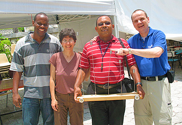 From left: Pierre Fouch�, UB graduate student in earthquake engineering; Sofia Tangalos, MCEER director of education and outreach and programs in Haiti, Jean-Richard Elie-Pierre, a seminar participant and owner of a Haitian architectural firm, and Andr� Filiatrault, MCEER director and UB professor display a teaching tool used at the May seminar in Haiti. The tool uses steel bar rods of different lengths to demonstrate how buildings of different heights have different natural frequencies. Photo: MCEER