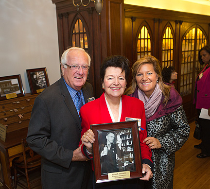 (From left) Bruce Boland, Elaine Boland and their daughter, Elaine Villalpando, hold a photo of Elaine Boland’s father, Joseph Sarnowski, owner of Clinton Pharmacy. Sarnowski donated the pharmacy cases in the background, part of the pharmacy museum and apothecary in Kapoor Hall. Click on the image to see a larger version. Photo: DOUGLAS LEVERE