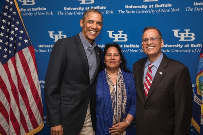 President Tripathi and his wife, Kamlesh, welcome President Obama to UB.
