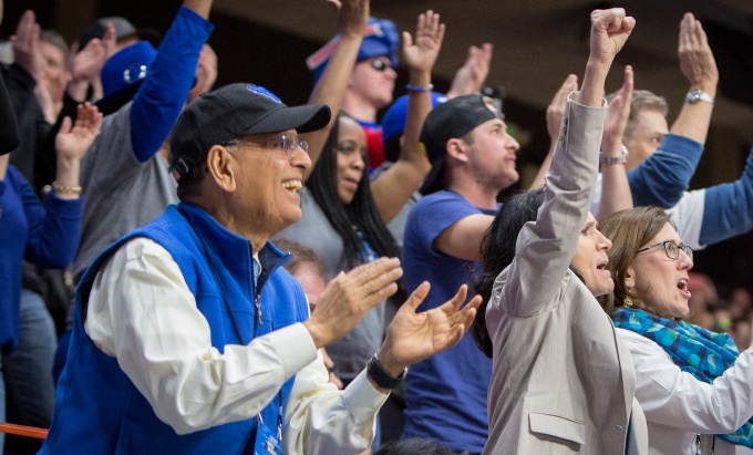 President Tripathi cheers on the UB Bulls as they take on Arizona in the first round of the NCAA Tournament in Boise, ID on March 15, 2018.