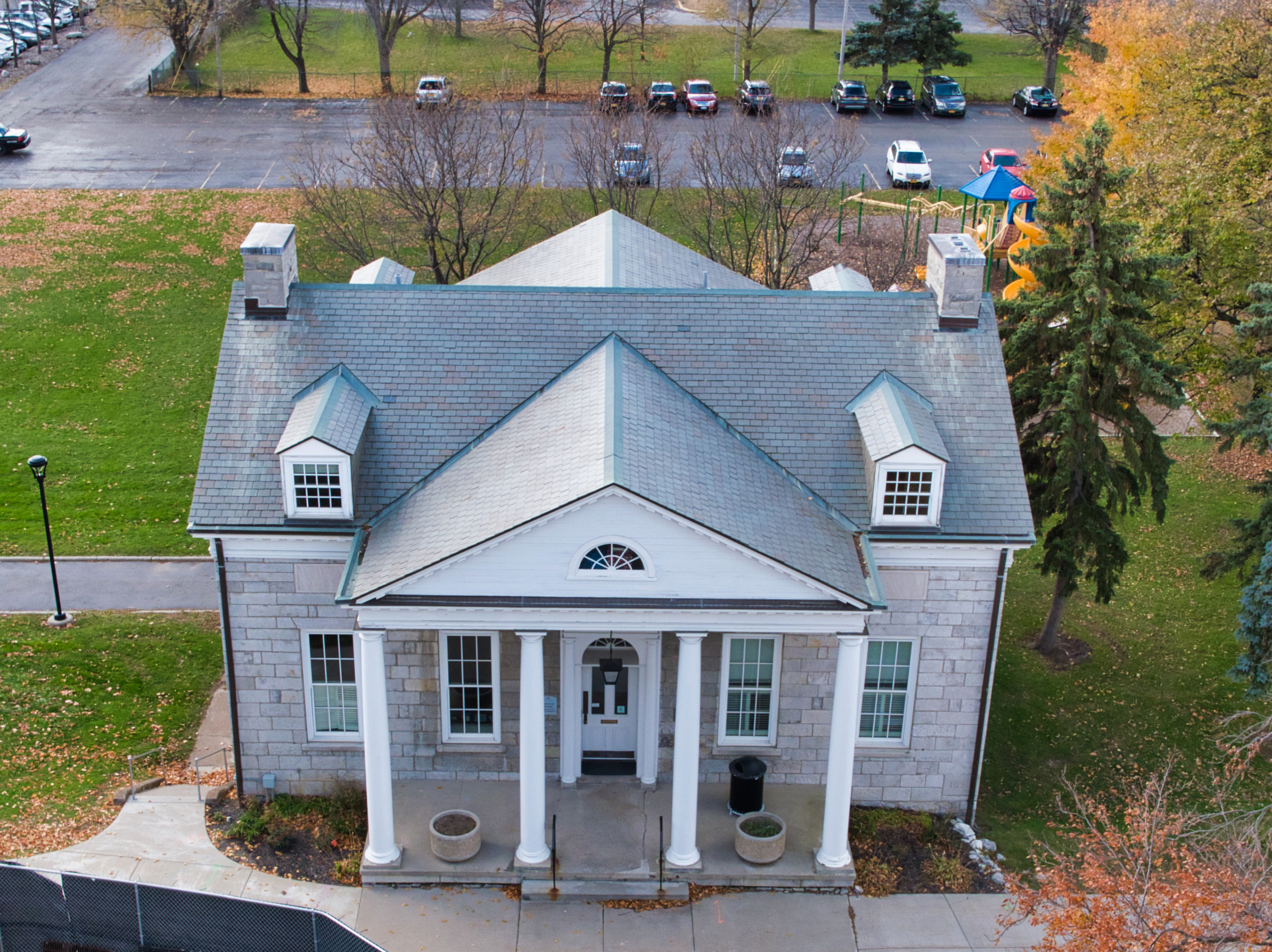 Beck Hall originally served as the university bookstore. It is modeled on the Holland Land Company building in nearby Batavia, New York. The Holland Land Company was the original developer of the city of Buffalo in the first decade of the nineteenth century.