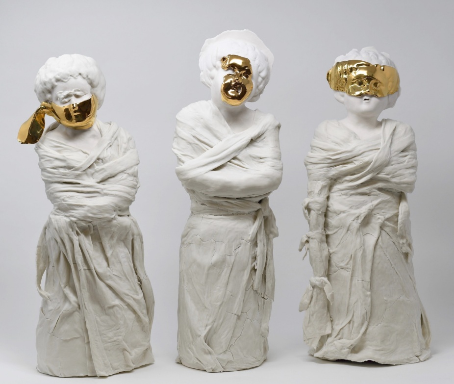 Kimberly Chapman, Gold Masked Women, 2020. Porcelain, glaze, gold luster, 18 x 5 x 4 ½ inches. Courtesy of the artist.