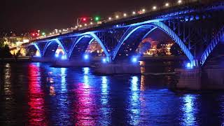 Its arches bathed in blue, the Peace Bridge gave a colorful kickoff to UB’s Homecoming and Family Weekend on Oct. 6. From dusk to 1 a.m., the span’s more than 600 LED floodlights flashed and pulsed from Buffalo on the American shore to Fort Erie on the Canadian, delivering a spectacular international light show ahead of the festivities. Those would include groundbreaking for the university’s new field house, alumni talks, faculty seminars, a rock concert, tailgate parties galore and one of the craziest games in the history of college football. The last time the Peace Bridge lighting system, installed in 2009, shone blue for UB? September 2011, for the inauguration of President Satish K. Tripathi.