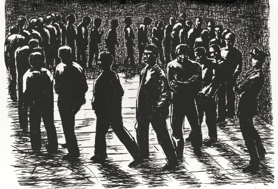 Screen print detail based on the etching, Newgate Prison Exercise Yard, by Gustave Doré, and a series of graphics from the late 1800s, as updated by Jos Sances, 1992. Image courtesy of the U.S Library of Congress.