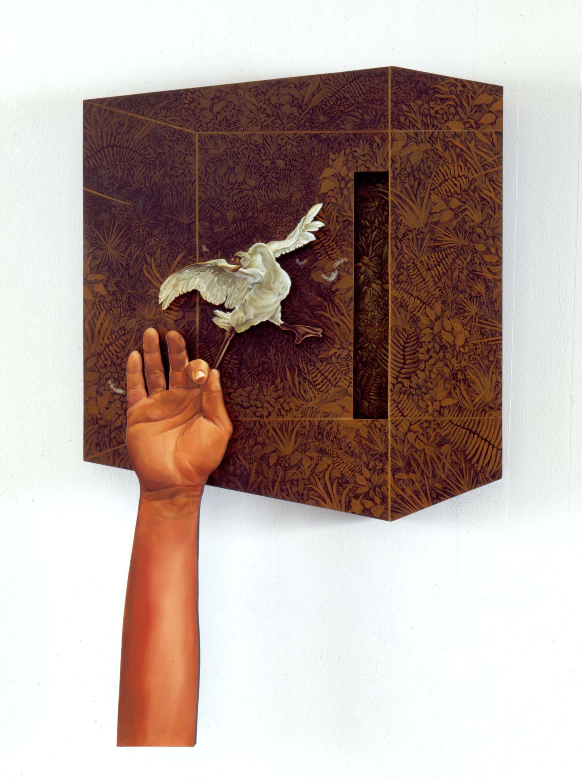 In 1972, Juan Carlos Llera’s family left Cuba and settled in Miami. Llera is a mixed-media artist who works as easily with traditional oil painting, as he does with manipulated computer-generated photographic and printing processes. Currently, his work is a mixture of computer imaging and traditional painting. The images he creates function as metaphors for Llera’s exploration of identity as he negotiates the threshold that separates his chosen media and his experience as a bicultural exile. His imagery is sometimes derived from Renaissance and Baroque art, through which he attempts to capture a certain spiritual significance.