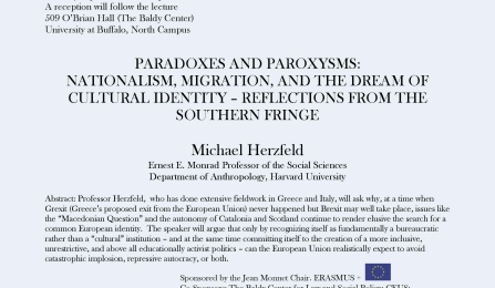 Abstract: Professor Michael Herzfeld, who has done extensive fieldwork in Greece and Italy, will ask why, at a time when Grexit (Greece’s proposed exit from the European Union) never happened but Brexit may well take place, issues like the “Macedonian Question” and the autonomy of Catalonia and Scotland continue to render elusive the search for a common European identity. He will argue that this search actually represents a political rhetoric that is inherently and demonstrably divisive. Given the rapid erosion of clear geographical, cultural, and even genetic definitions of “Europe,” the “idea of Europe” looks increasingly parochial, a desperate attempt by countries formerly dominating the world to recreate their hegemony more locally, while the “fringe” countries that bear the brunt of this process are increasingly responding to such developments with populist versions of 19th-century romantic nationalism and with attendant claims to magnificent histories as the bedrock of an idealized European identity. By asking how these tensions play out in the intimate spaces studied by anthropologists, the speaker will argue that only by recognizing itself as fundamentally a bureaucratic rather than a “cultural” institution – and at the same time committing itself to the creation of a more inclusive, unrestrictive, and above all educationally activist politics – can the European Union realistically expect to avoid catastrophic implosion, repressive autocracy, or both.