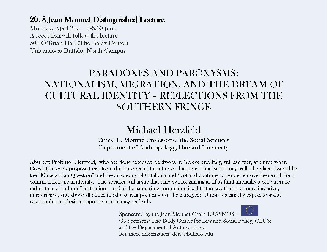Professor Michael Herzfeld will present the 2018 Jean Monnet Distinguished Lecture at the University at Buffalo.