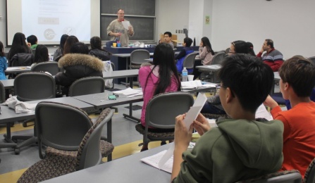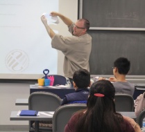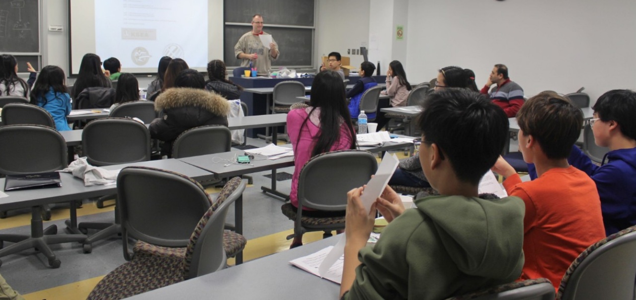 Students in grades 4-8 and 9-11 worked on solving math problems for one hour and 1.5 hours, respectively. The problem solving session was followed by a special lecture delivered by Professor David Hemmer, the chairperson of UB Mathematics Department. Hemmer’s lecture on the Moebius strip included hand-on activities which provided an opportunity for students to explore the mysterious Moebius strip through paper, scissors and tape. Afterwards, Hemmer also answered students’ questions such as “What is the fourth dimension” and “What kind of jobs do people have after they study math?” The event closed with a brief award ceremony, where all students received a certificate of recognition.