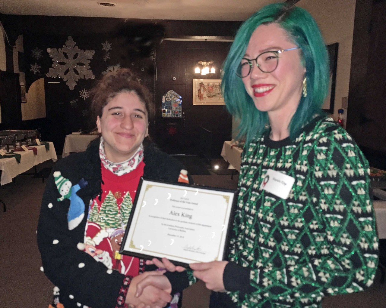 (From left) Angela Menditto, President, UB Graduate Philosophy Association (GPA) present the 2018 Outstanding Faculty Award to Dr. Alexandra King.