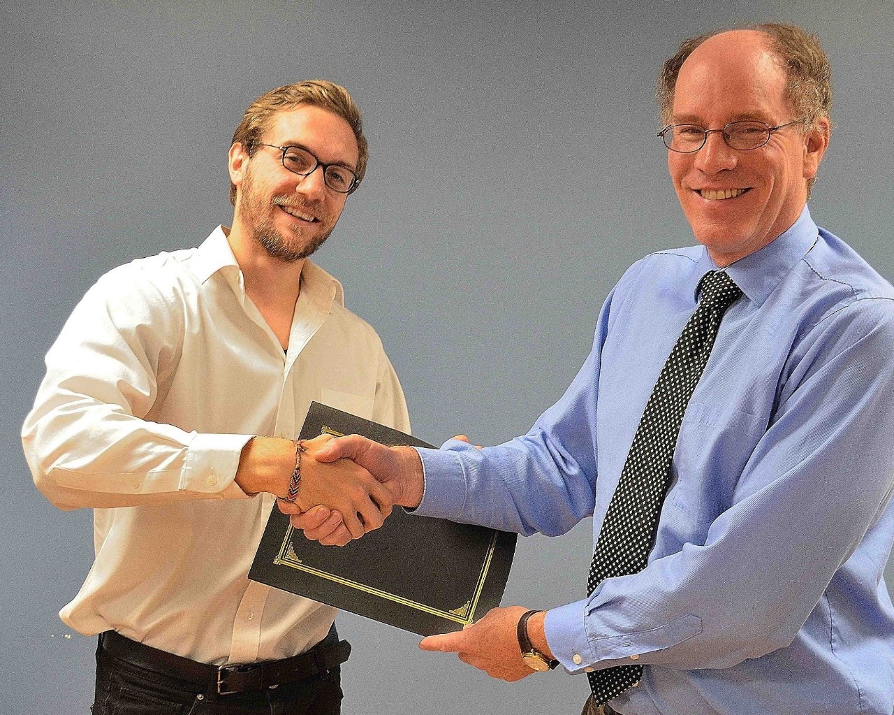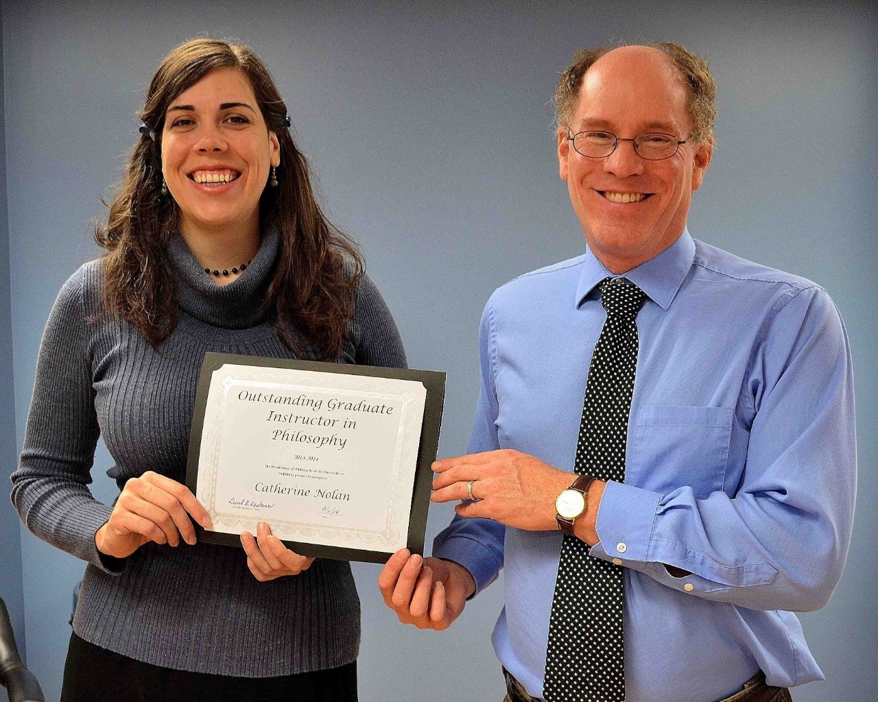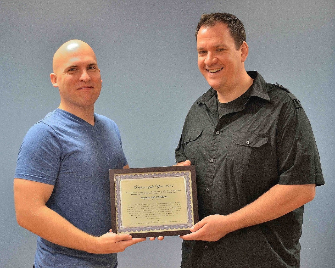 Associate Professor Neil E. Williams (right) receives the "Professor of the Year 2014", bestowed by the graduate students. The award was presented by Graduate Student John Beverley (left).