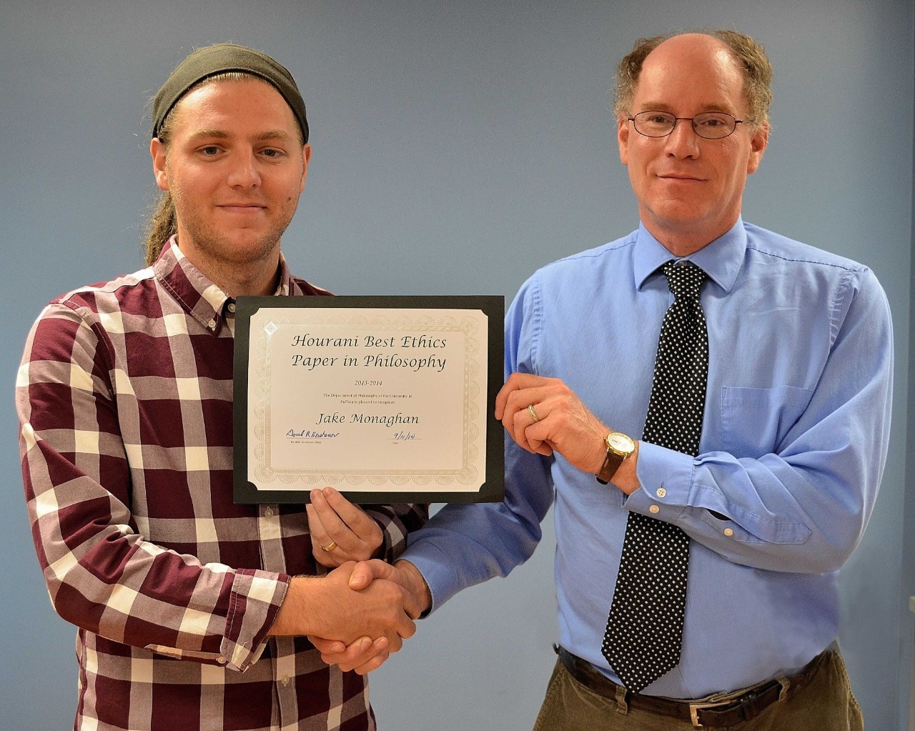 The Hourani Award for the Outstanding Essay in Ethics went to Jake Monaghan (left) for his paper, “Contaminated Intuitions from McMahan’s Sperm Donor Case.” The award was presented by Professor David B. Hershenov, Department Chair (right).
