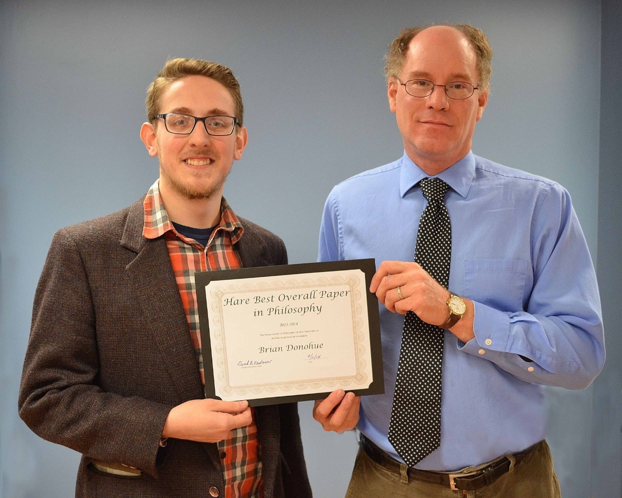 The Hare Award for Outstanding Essay was bestowed upon Brian Donahue for his paper “Macro Powers." The award was presented by Professor David B. Hershenov, Department Chair (right).