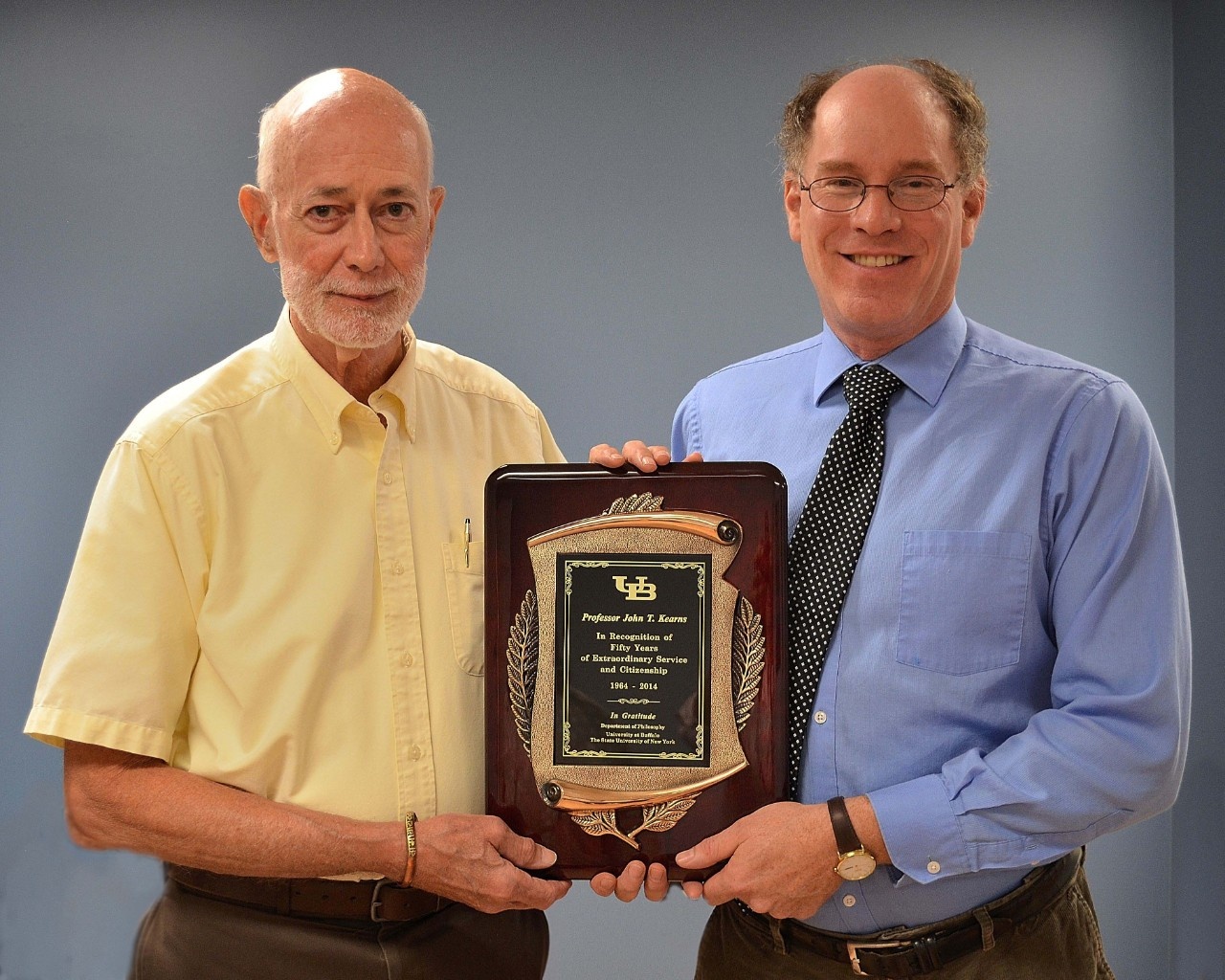 A Plaque recognizing Fifty Years of Scholarship, Teaching and Service was given to Professor John Kearns (left). The award was presented by Professor David B. Hershenov, Department Chair (right).