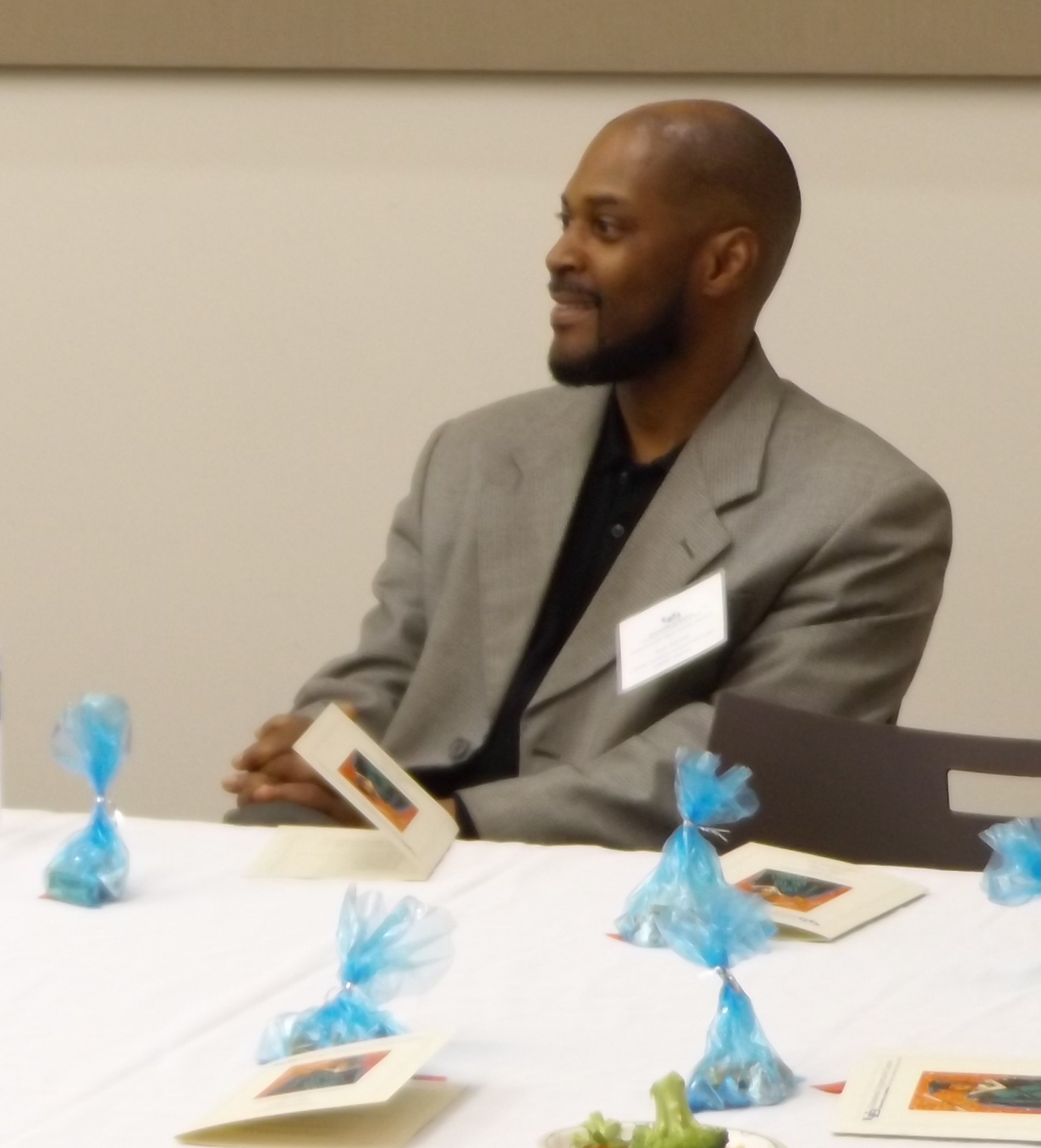 Alumnus embraces the Super Hero theme at a Strengthening Families Celebration