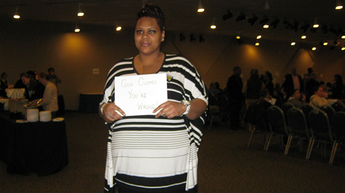 During an event where others are seated, a woman holds up a handwritten sign to the camera that says, "Governor Cuomo, you're wrong!"