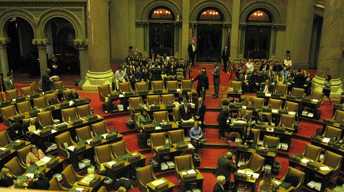 Individuals seated and looking on during the 2014 Albany Caucus in session