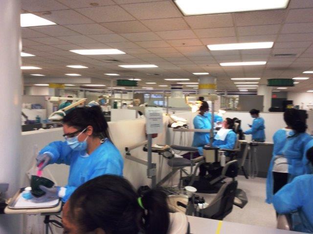 Dental Assisting school students in scrubs, one seated in a dental chair, the others working together