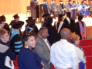 Audience, graduates and faculty stand at attention