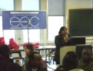 person presenting in a room with EOC banner in background