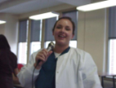 one person with microphone while others watch