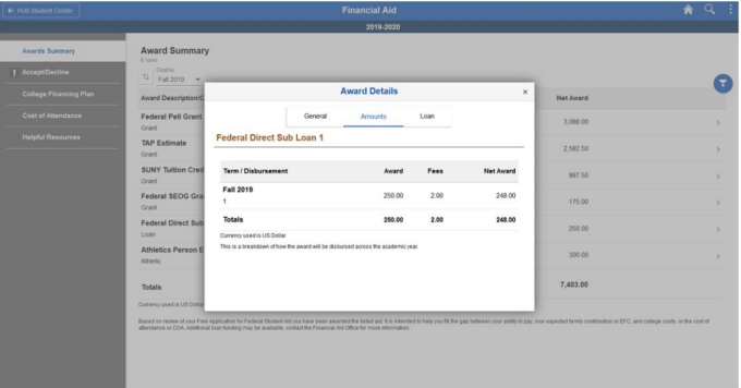 The Financial Aid Office notifies students when financial aid packages become available each year. Once notified, students are able to view financial aid awards in HUB at any time.