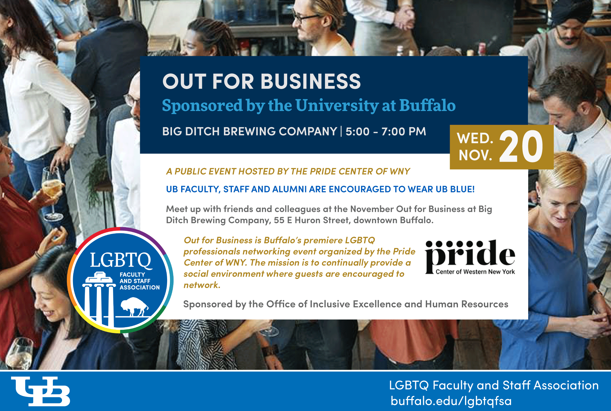 Wednesday, November 20, 2019 | 5:00pm-7:00pm | Big Ditch Brewing Company. Meet up with UB friends and colleagues at the Pride Center of WNY's Out for Business! Big Ditch Brewing Company is located in downtown Buffalo at 55 E Huron Street.
