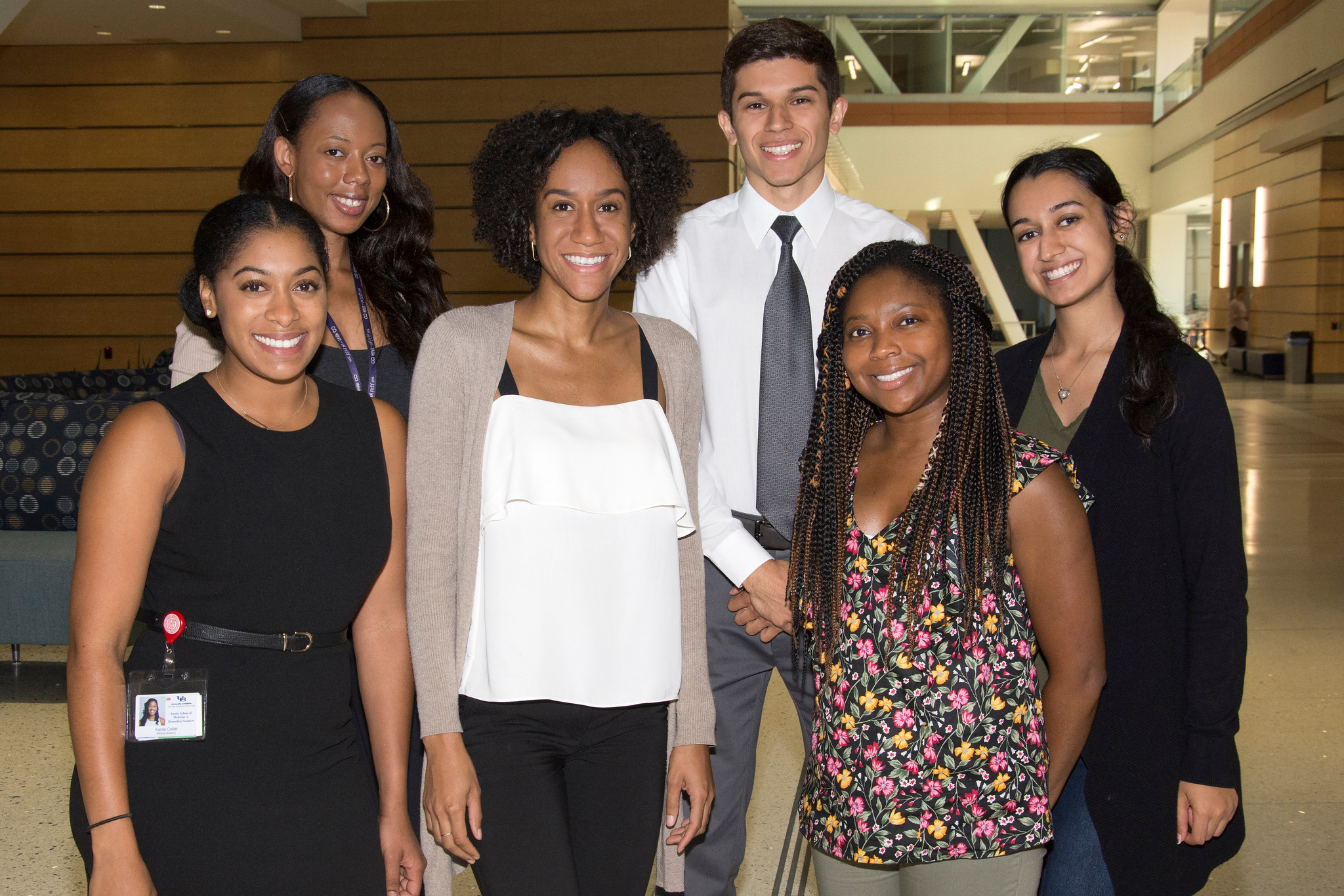 Left to Right: Karole Collier, who initiated last year's Second Look weekend, Danielle Dunn, Micha Gooden, Gabriel Gomez-Chaves, Jalisa Kelly, and Nazeela Tanweer, all UB medical students, who attended the Jacobs School's Second Look weekend in May. (Photo: Sandra Kicman)