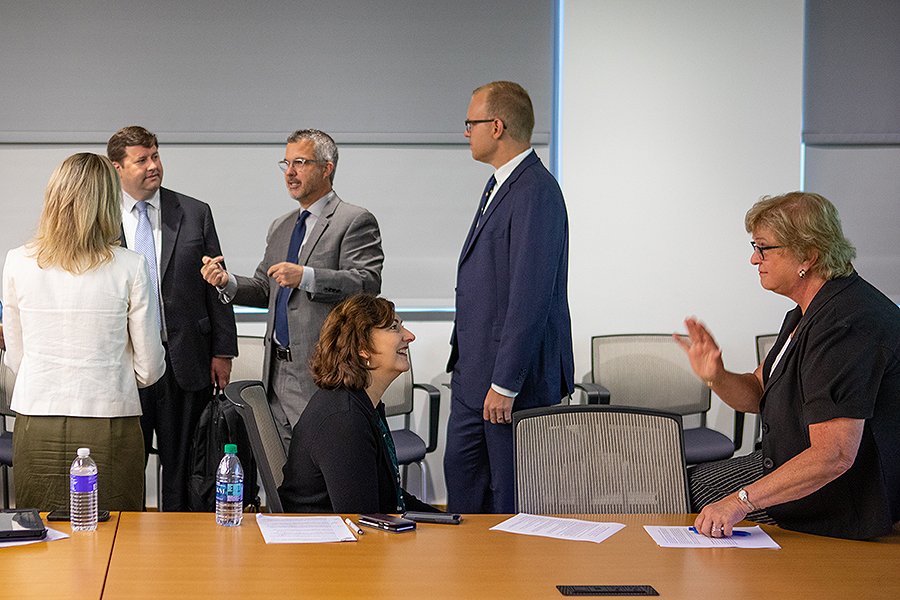 Narelle Ellendon, RN, opioid program manager of the Office of Drug User Health, Department of Health, seated on the left, discussed statewide progress with Nancy Nielsen, MD, senior associate dean for health policy, after the UB briefing. Behind them, standing L to R are Brian Clemency, DO, associate professor of emergency medicine, Don Elick, assistant vice president for corporate and foundation relations and Joshua Lynch, DO, Buffalo MATTERS founder and clinical assistant professor of emergency medicine, all of UB. (Credit: Douglas Levere, University at Buffalo)