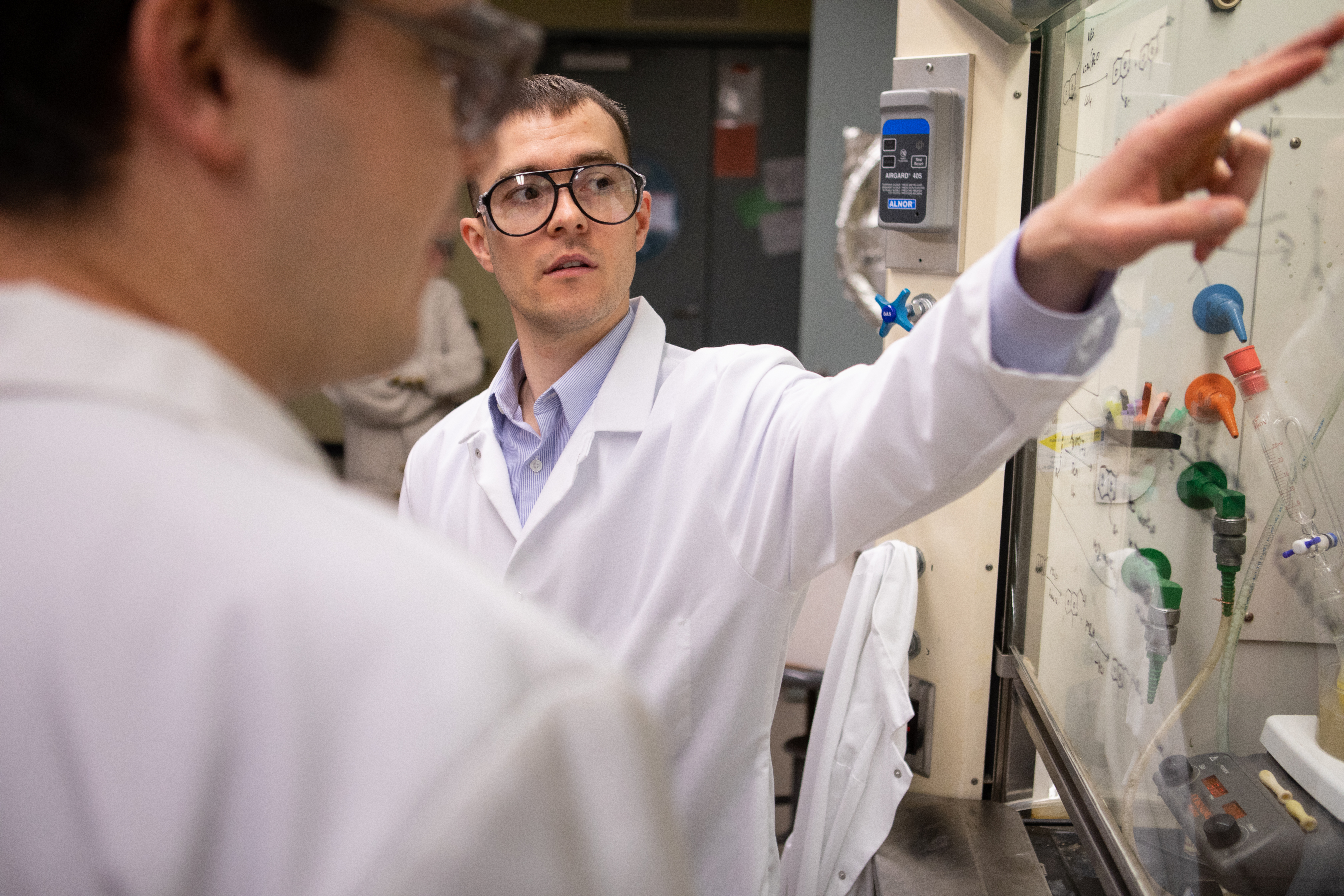 Diagrams sketched onto chemical fume hoods depict the work of the Lacy Lab. The lab studies both ruthenium- and manganese-based catalysts, with the goal of improving the performance of catalysts and finding more cost-effective compounds that can act as catalysts. Credit: Douglas Levere / University at Buffalo