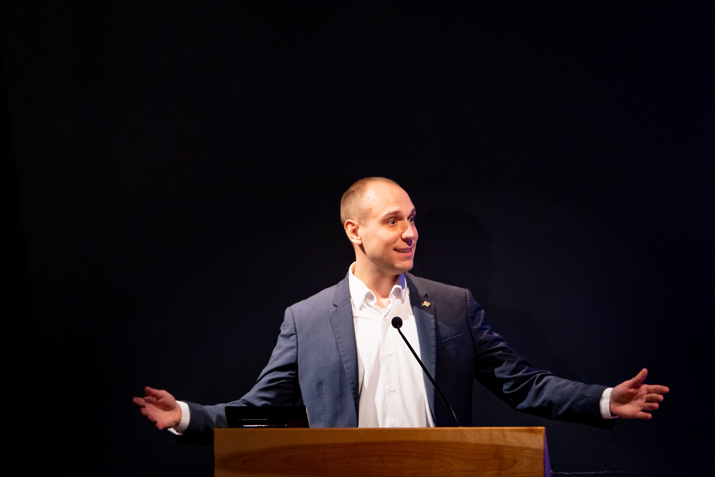 Emcee and inaugural 3MT winner, Phil Schneider, kicks off the start of the sixth annual 3MT competition.