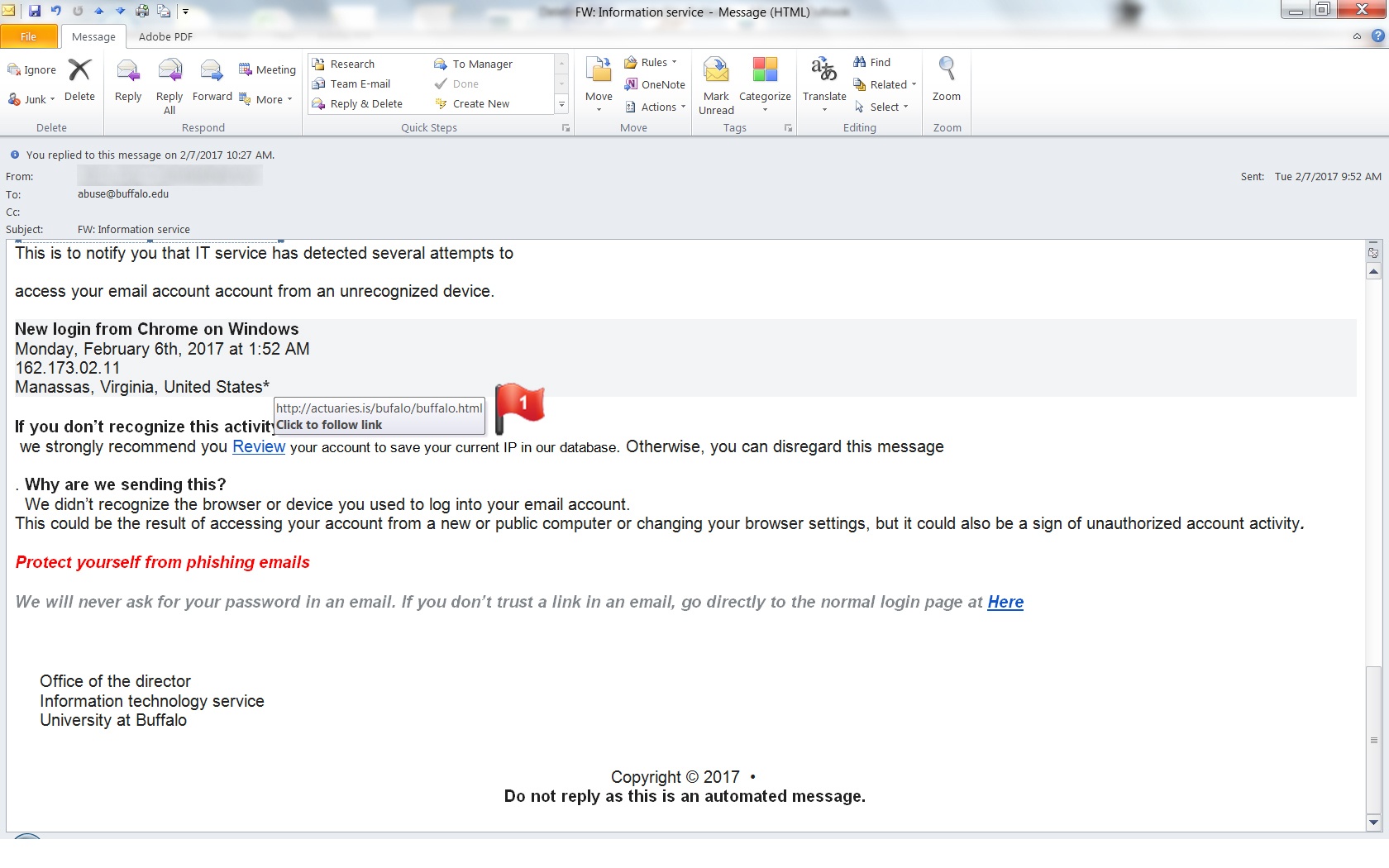 An email claiming to come from UB states that access your email account has occurred from an unrecognized device is attempting to convince you to give away your UBIT name and password.