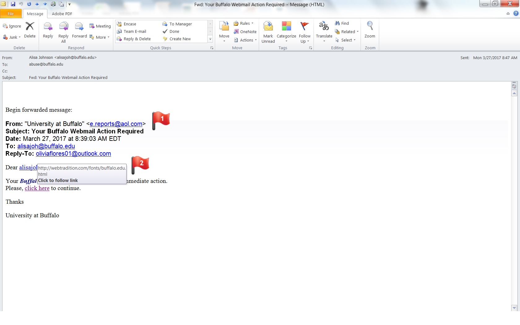 An email supposedly from the University at Buffalo claims that your webmail account requires appropriate action.