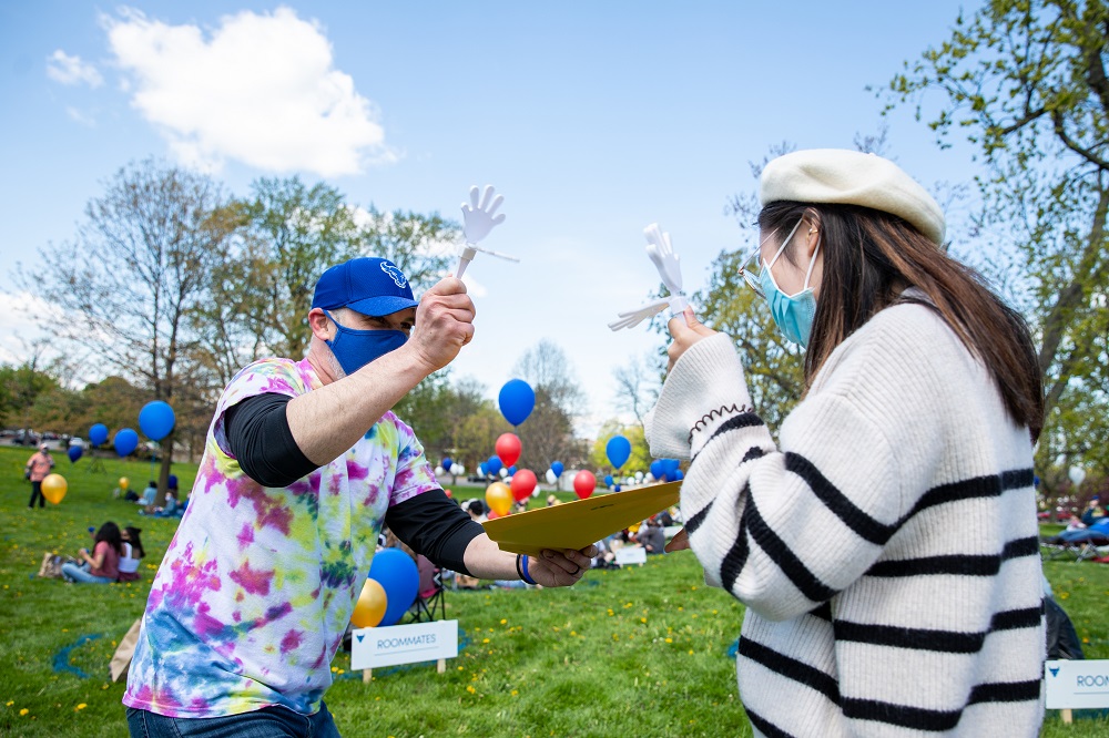 The event was carefully organized to ensure a safe celebration, with masked guests seated on the lawn in spray-painted circles spaced six feet apart, and “roommate pods” grouped together (the circles and balloon markers were arranged by sophomore architecture students in the shape of an interlocking "UB"). Faculty and staff raced from pod to pod to hand-deliver awards.