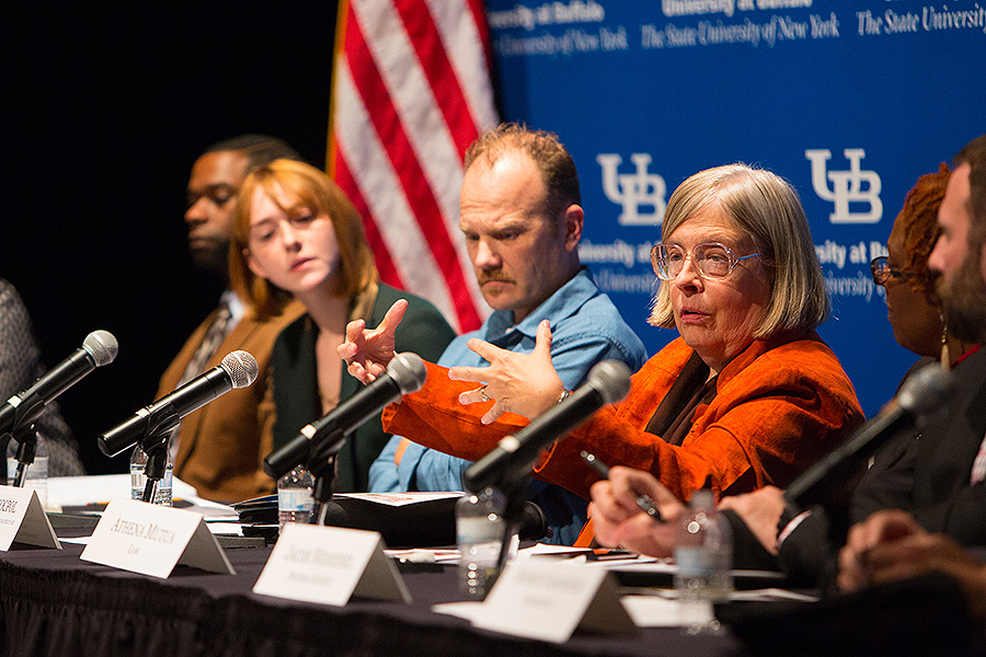During the midday panel discussion in the CFA’s Black Box Theatre, more UB faculty from history, law, English and other disciplines joined Skocpol on stage with moderator Robert Granfield, vice provost of faculty affairs, to address topics from Donald Trump’s influence on political science to the important role of the humanities in encouraging democracy. Truman Scholar Madelaine Britt, a double-major in political science and environmental design, and the sole student panelist, spoke about the need for sustainable urban planning to support social equality in U.S. cities.