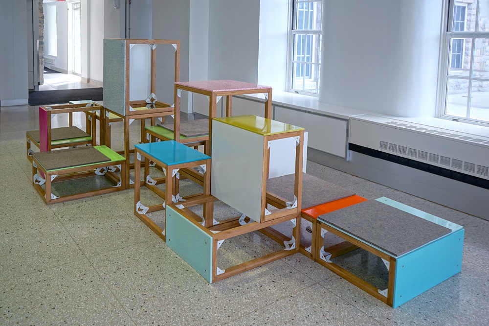 Designed as a flexible system for display and seating, the 60 units have been stacked and arranged as mounting for student and professional exhibitions, and a landscape of colorful seating for receptions. It was even appropriated into an ensemble of instrument platforms for an impromptu concert.