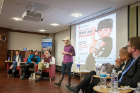 Kruger, clinical assistant professor in the Department of Community Health and Health Behavior, made the cheeriest presentation of the evening, using a barrage of internet memes and props from her “adventure vest” to draw laughter from the crowd. She pleaded that her knowledge of public health could benefit society by preventing serious injury or sickness, and promoting wellness.