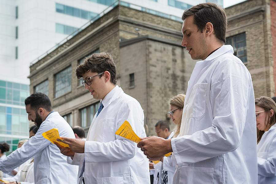 New doctors donned their long white coats for the first time during an outdoor ceremony June 21 at the Jacobs School of Medicine and Biomedical Sciences in downtown Buffalo.