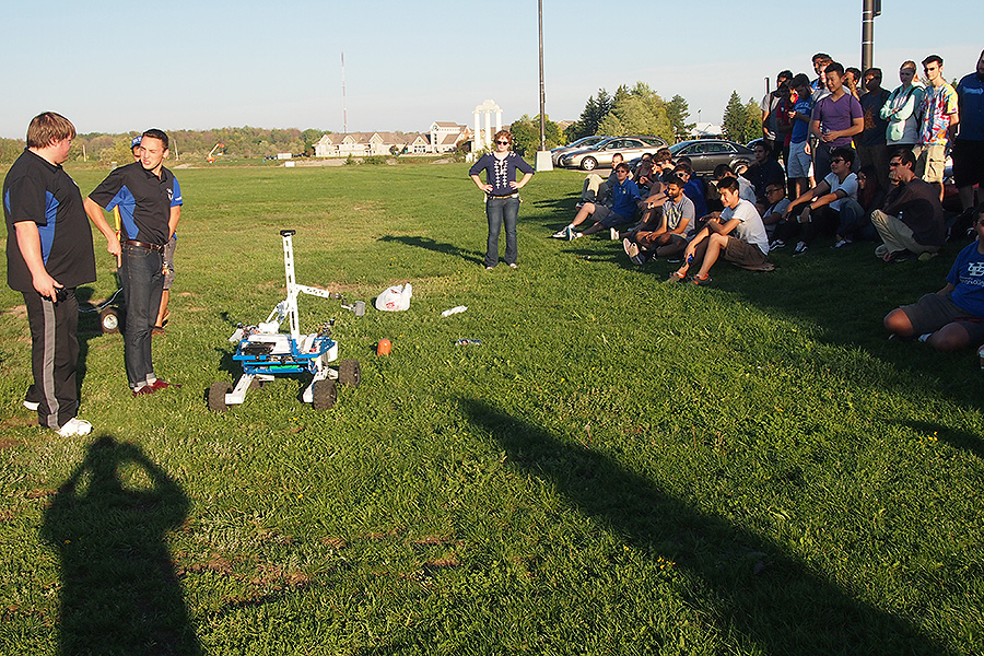 The UB Space Bulls show off their latest rover. Each year, the team of engineering students competes in a NASA competition among universities to design the best machine for navigating Mars.