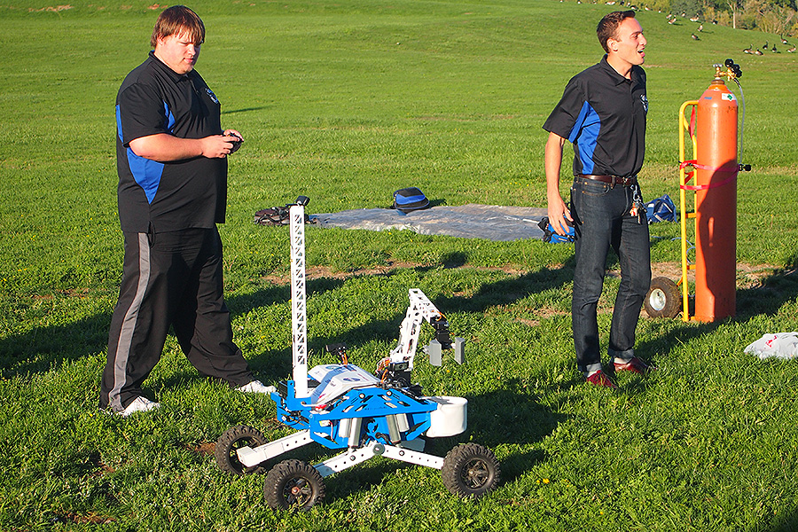 From left: Graduate students Kyle Thompson, electrical engineering, and Livio Forte III, mechanical and aerospace engineering, get the remote-controlled rover ready for a demonstration.