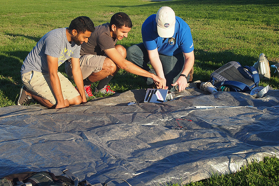 From left: Students Rohan Kuriakose, Ali Alqaraghuli and Aaron Schwab prepare the instruments for the weather balloon launch.