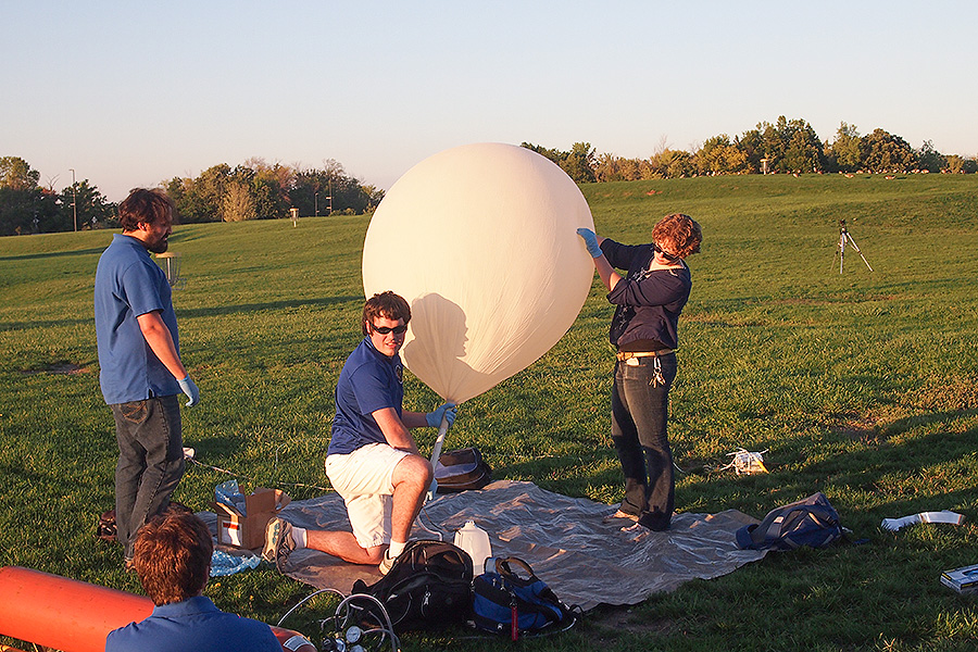 From left: Brian Bezanson, Mara Boardman and Andrew Dianetti, all members of the Nanosatellite Lab, prepare the balloon for launch.