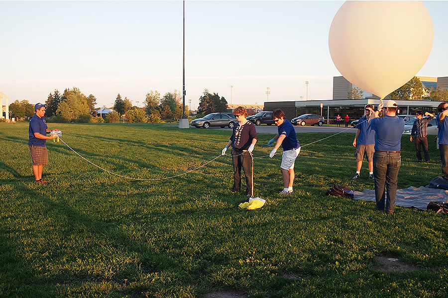 Maura Sutherland (foreground), a junior double-majoring in aerospace and mechanical engineering, helps gather the UB Nanosatellite Lab troops to conduct an experiment with a weather balloon.