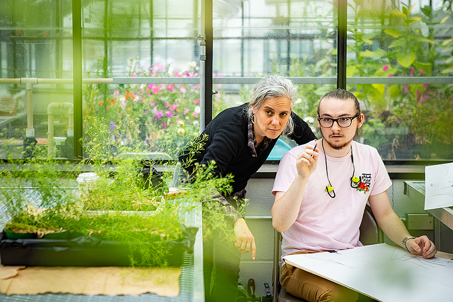 Students in Joan Linder’s drawing course recently ventured into the greenhouses next to Dorsheimer Laboratory on the North Campus to sketch plants. The course is the second of a two-semester offering that focuses on drawing as a foundation for all the visual arts. Course projects such as this one are structured to make visible the internal world of emotions, imagination, memory and opinion. Linder is chair of the Department of Art in the College of Arts and Sciences. Photos: Douglas Levere