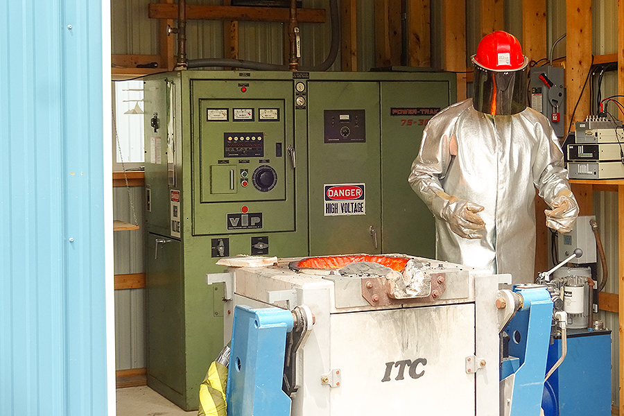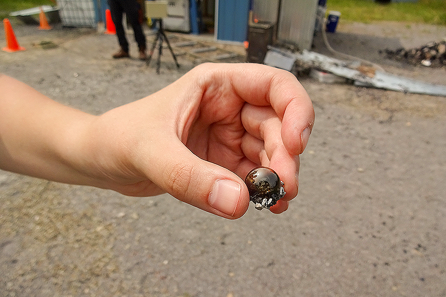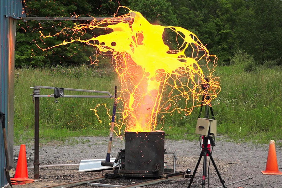 At UB’s Geohazards Field Station in Ashford, scientists melt basaltic rock to make lava, and then inject the molten mixture with water to cause an explosion. These rare experiments explore important questions in volcanology. The research sheds light on the basic physics of lava-water interactions, which can make eruptions more dangerous. The field station, some 40 miles south of Buffalo, is run by the Center for Geohazards Studies in UB’s College of Arts and Sciences.