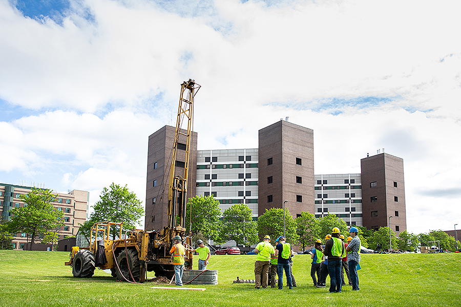 The North Campus has a new feature: three crowdfunded wells. This spring, more than 50 donors, including many geology alumni, gave $10,000 to support the drilling of the wells and other aspects of a geological field methods course. Students usually travel out west each summer to complete the course, known colloquially as “field camp.” But with the pandemic, students stayed local this year. The class provides undergraduates with hands-on experiences critical to geology careers, and the wells will be used in many future hydrogeology courses. Photos: Meredith Forrest Kulwicki