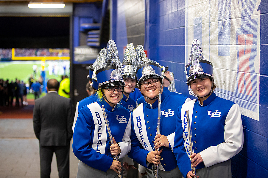 UB's marching band, The Thunder of the East, was invited by the Buffalo Bills to make an appearance during the team's home opener against the Tennessee Titans. It was a perfect night: The band marched onto the Highmark Stadium field and entertained Bills' fans and others across the country during “Monday Night Football,” and the Bills won big — 41-7. Photos: Meredith Forrest Kulwicki
