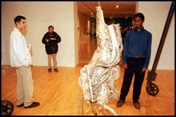Joseph J. Scona (left) and Abdur-Rahman Morgan (right) examine an engine encased in python skin at the opening reception Friday night of “Artificial Life in the Valley of the World,” an exhibit by El Paso, Texas, artist James Drake that is on display in the UB Art Gallery through March 9. |