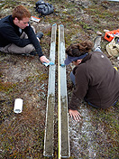 • UB students Shanna Losee and Will Phillips inspect a sediment core from Pluto Lake. The thick, gray layer was deposited during an advance of Jakobshavn Isbrae about 9,200 years ago.