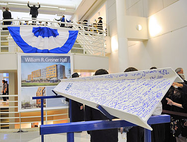 Among those who took the microphone was Jeremy M. Jacobs, chair of the UB Council, who announced that the university would name its newest student housing project after Greiner. William R. Greiner Hall, formerly known as South Ellicott Suites, will blend residential, academic and recreational areas—a fitting tribute for a man who worked tirelessly to enrich the community life of the university. At a reception following Tuesday’s formal program, guests lined up to sign a structural beam for the new building on the North Campus adjacent to the Ellicott Complex, which is expected to be ready for occupancy in fall 2011.